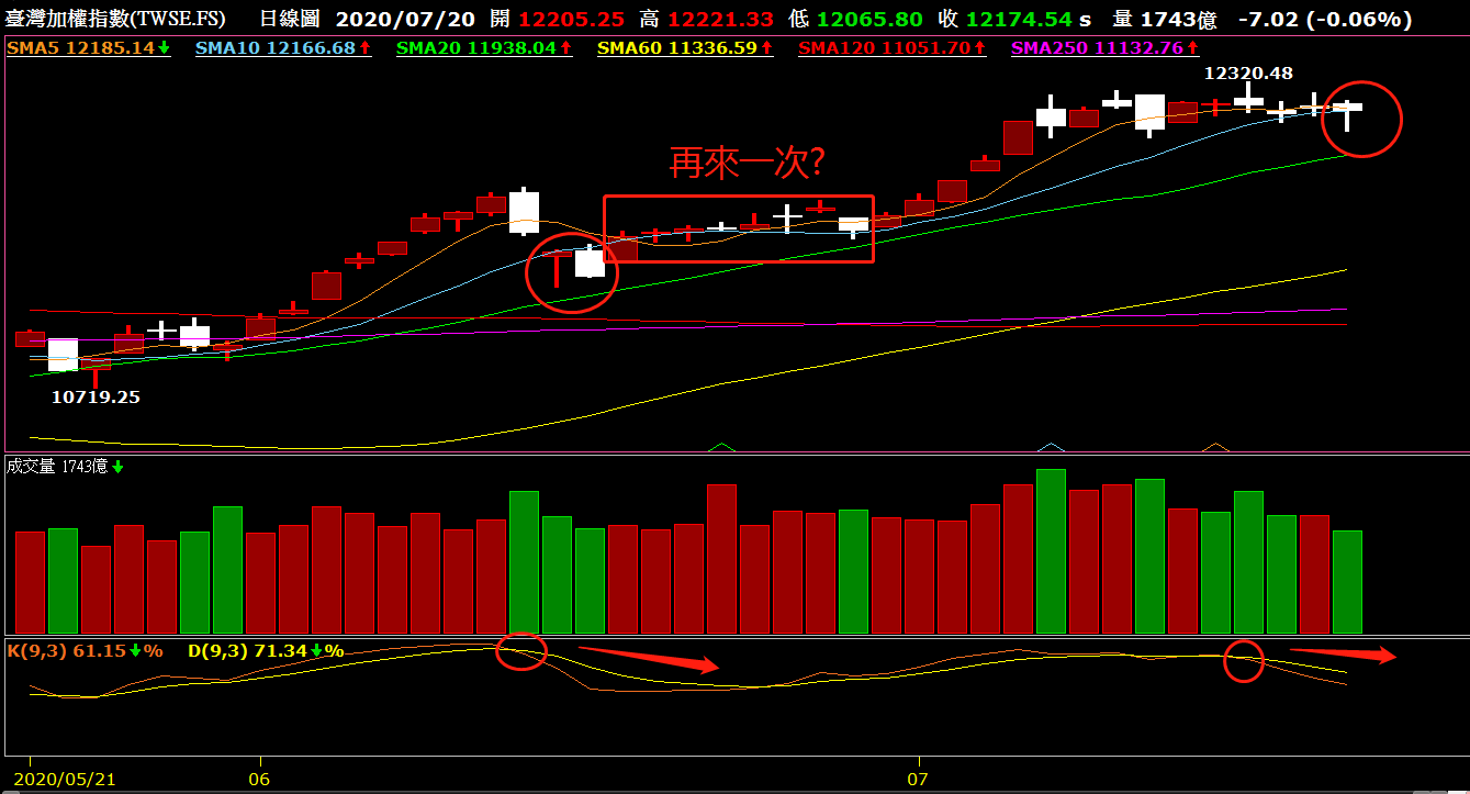 7月20日台灣加權指數跌7點,收12174.54點,量縮價跌的十字陰線,由於在12000附近震盪10個交易日,盤中跌破又拉上來,不排除重演6月12~29日在10日均線附近震盪,等待20日均線向上形成糾結,類似5月在10700~11000點區間震盪、糾結均線的格局,因此短線因台指期周結算可能再次拉回測試20日均線,但隨著籌碼逐漸沉澱,中多還是有機會。