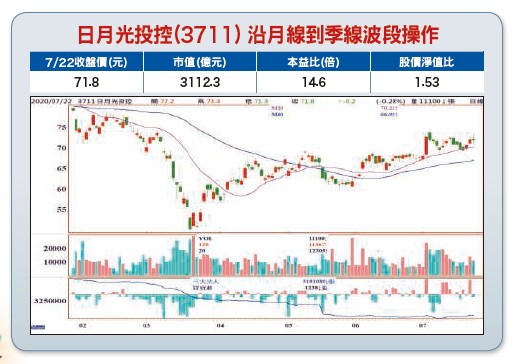日月光投控(3711)第一季營運淡季不淡,EPS 0.92元,年增達90%,累計一至六月合併營收年增14.09%,法人推估,日月光投控上半年EPS可上看二元以上,預計八月十三日除息二元。