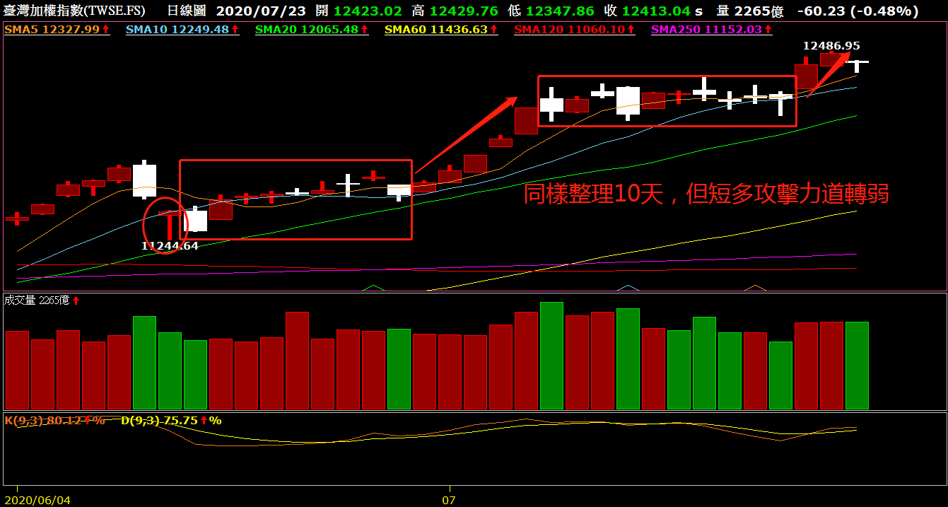 7月23日台灣加權指數跌60.23點,收12413.04點,量增價跌的T字陰線,把22日的漲幅吐回去,雖然守住5日均線,但K線組合構成「紅黑並列」的轉折訊號,如果24日之後跌破5日均線的話,短線將構成「買跌夜星」,短線的風險提高。自6月初走8連陽,7月初走5連陽,這次整理10天後僅漲2連陽,多頭續漲的力度略轉弱,面對12682歷史高點,市場還是比較謹慎,留意關前整理的可能性。
