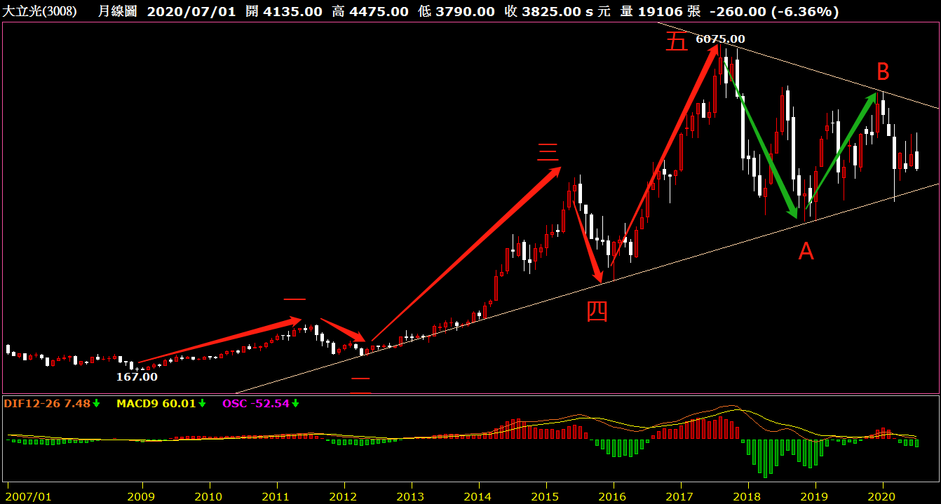 就在蘋果的財報公布之前,高通暗示iPhone12趕不上9月上市,考驗蘋概股的籌碼穩定度,首當其衝的必然是大立光第三季財報仍沒有起色,大立光自2017年衝到6075的歷史高點後,在3000-5000點之間震盪36個月,構成ABC波整理,從結構上來看,屬於5-3-5波的結構,目前處在C-2的結構,須提防持股信心鬆動的破線訊號。蘋概股當中,有創新高的欣興、南電,也有弱勢的台郡、茂林-KY,力成,更有整理待變的國巨、超眾、精材,週五的蘋果財報將是關鍵。