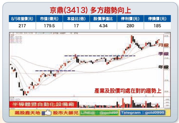 【個股推薦】京鼎(3413),鴻海集團旗下子公司,鴻海集團旗下半導體暨自動化設備廠。中國大陸方面,南京浦口建廠規畫持續進行,主要鎖定在非製程設備,包含微汙染防治系統。主要利基題材有: