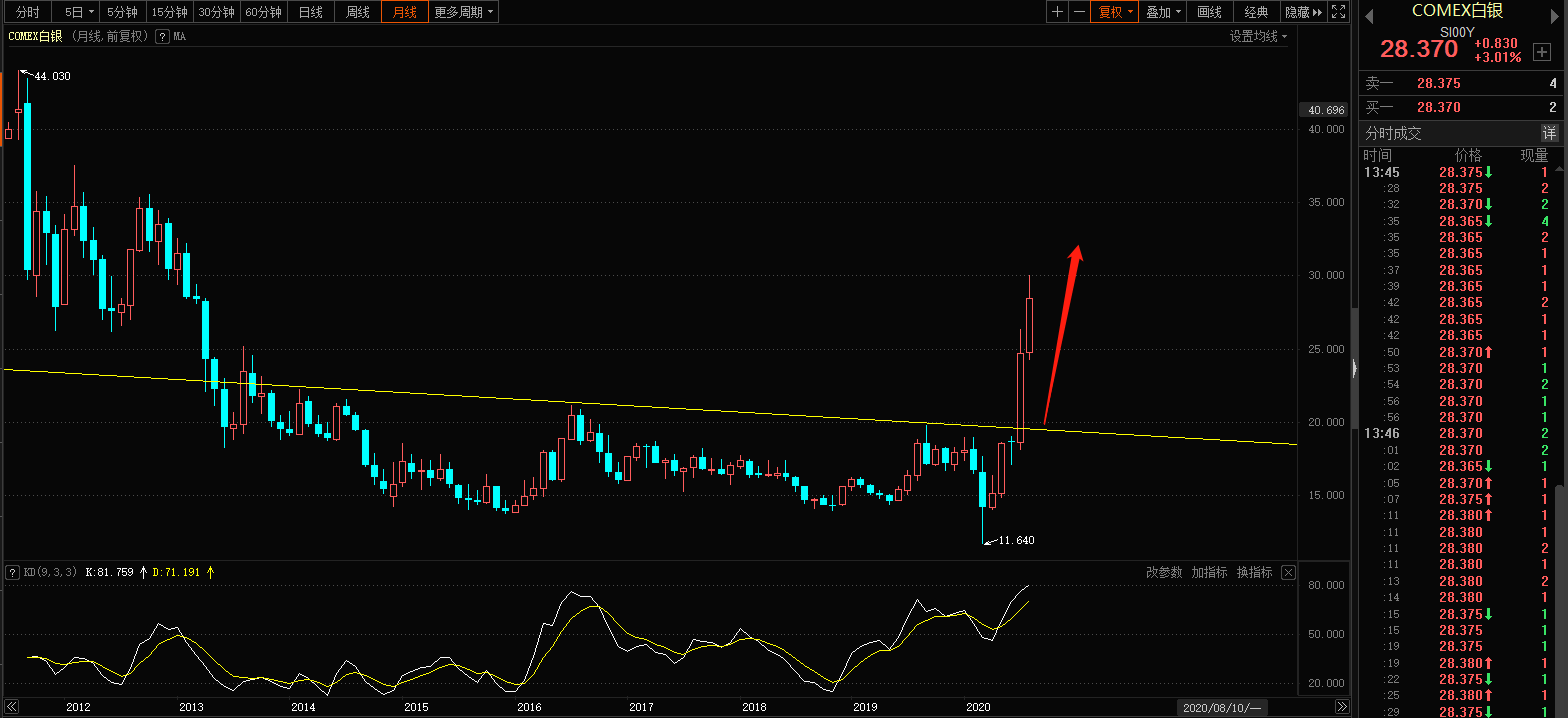已經創歷史新高的金價,接下來的目標價自然容易被哄抬,高盛喊出三千美元,自然是聽聽就好,因為儘管同屬貴金屬的COMEX白銀自三月的14.155美元(低點是11.64美元)上漲到八月的29.915美元高點,累積漲幅達1.11倍,但距離2011年的44.03美元前高還有35.49%的補漲空間,所以可以發現自七月以來白銀的上漲速度比黃金來得強勢,暗示著仍深具潛力。