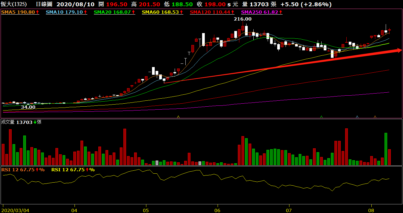 不過近期台灣內部可能有潛伏的COVID-19新冠病毒帶原者,可能存在社區感染的威脅,加上時序已經立秋,再過不久,暑假就會結束,台灣的第二波防疫才剛開始備戰,最省錢又有效的防疫措施就是戴口罩,上週提示的口罩業績股─恆大,八月七日漲到210元高點,就差六元就可以平前高,關前爆量收下跌的十字線,可能進入200元的震盪期,上半年EPS超過八元,六月EPS 3.06元,下半年口罩仍得戴的情況下,全年EPS應可超過20元,逼近25元,則本益比才四倍,可以說是標準的轉機黑馬股,重點是明年上半年看起來疫情一時半刻也解除不了,仍可持續追蹤。