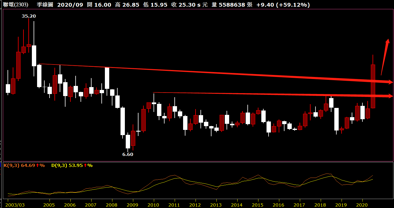 回到技術線型來看,港股的中芯國際在七月創了2004年掛牌以來新高,而聯電才剛突破十年的大底,這代表獲利能力比中芯國際來得更好的聯電具有補漲空間。