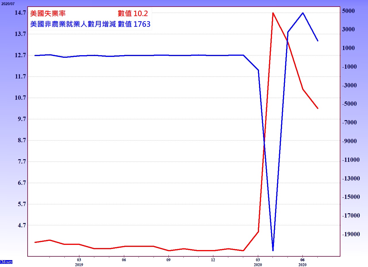大非農就業人數是衡量美國就業市場的重要參考指標,也是聯準會調整利率的唯二參考數據,自從四月份因COVID-19疫情造成大量的失業人口,一口氣急遽丟掉了2078.7萬就業崗位後,五月的大非農快速上揚至272.5萬人,六月再新增479.1萬人,七月再新增176.3萬人,合計近三個月共新增927.9萬人,佔四月失業人口的44.63%。
