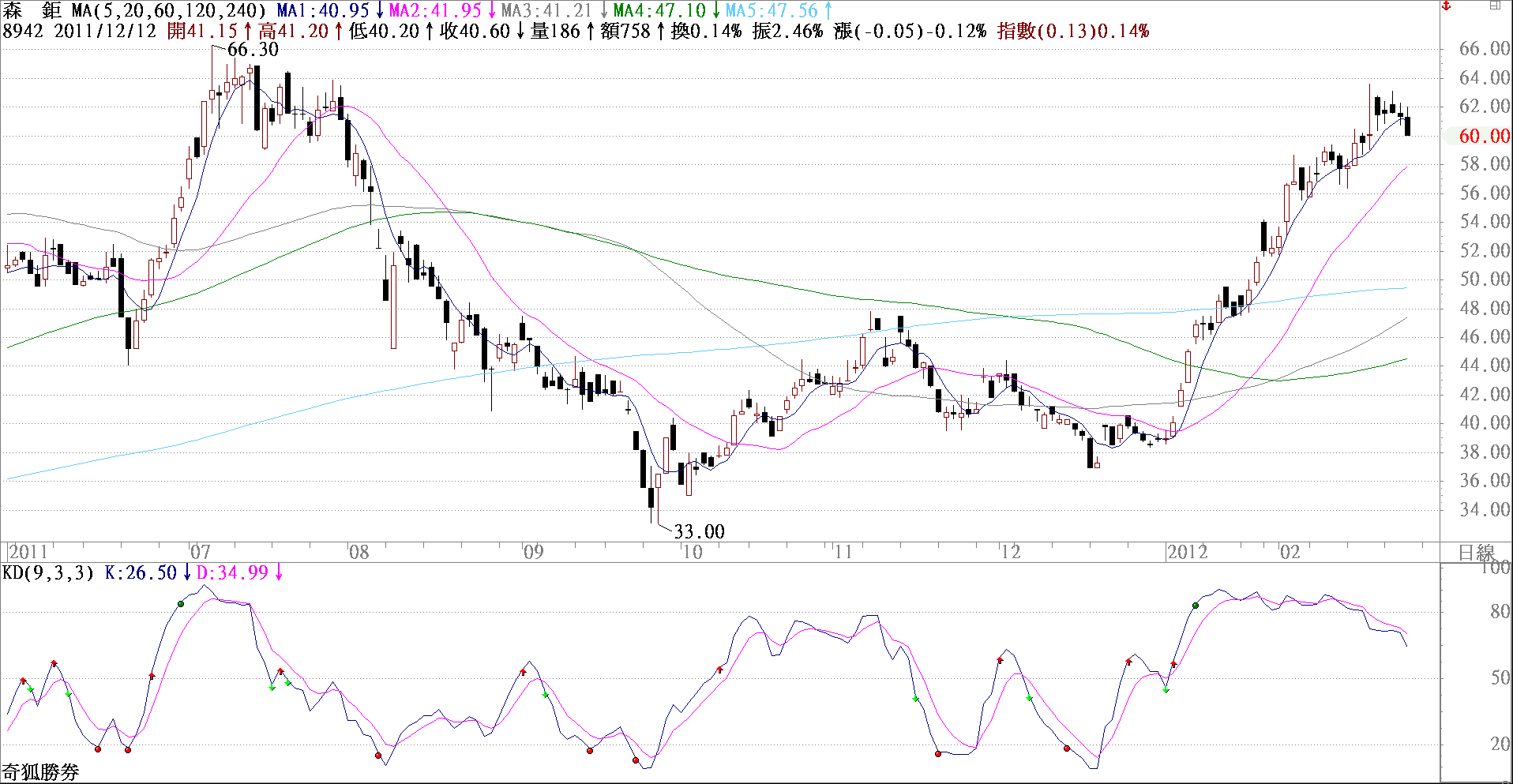 (2)日KD指標的K值出現兩次黃金交叉的訊號,也就是KD指標戴眼鏡的發動點於2012/01/03出現,後面股價續漲往上飆漲到63.6元。