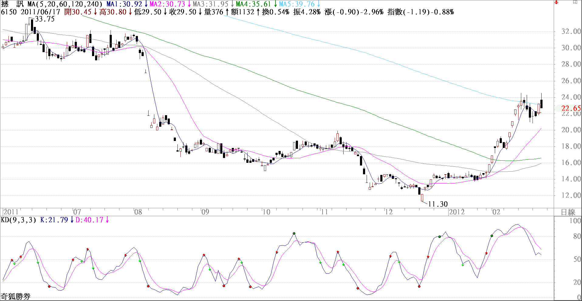 (2)日KD指標的K值出現兩次黃金交叉的訊號,也就是KD指標戴眼鏡的發動點於2012/01/18出現,後面股價續漲往上飆漲到63.6元。從2012/01/18出現黃金交叉,當時的收盤在11.35元,距離圖中高點18.8元,其間利潤高達66%,約漲了二十一天的時間。