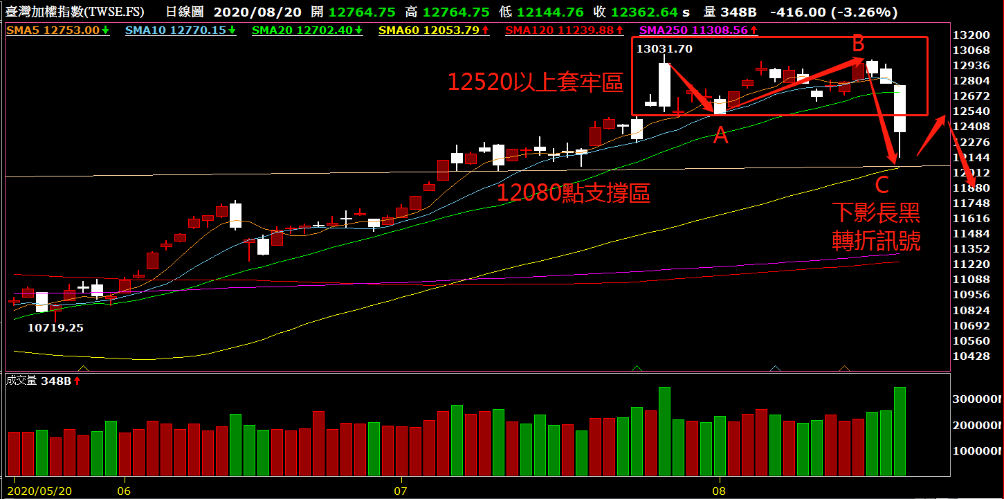 8月20日台灣加權指數跌416點,收12362.64點,3480億元的下影長黑K,盤中12144低點逼近季線的12054點支撐,表示7月28日在台積電二連板改寫30年的12682歷史高點,樂觀追進的3490億大量,經過16個交易日在12520~13060點高位震盪後,最終以止損認賠做收,短線上已有ABC整理波的架構,配合下影長黑的轉折向上訊號,加權指數或有反彈的機會,慎選個股、汰弱留強。