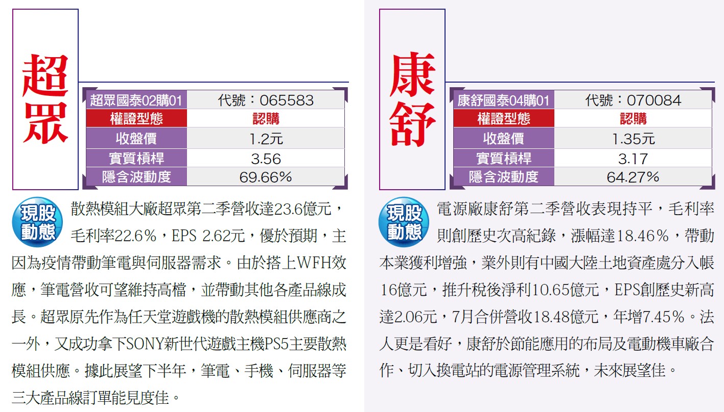奇鋐(3017):受惠於遠距辦公帶動筆電需求升溫,奇鋐第二季營收達一一六.○五億元,季增五五%,年增二二.三六%。由於全球疫情仍未見穩定,法人預期奇鋐的筆電風扇、散熱模組訂單動能將可延續至下半年,有助營運維持成長。
