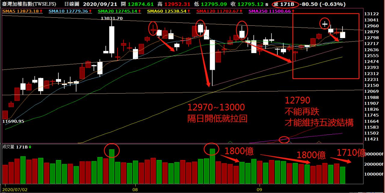 就甘氏角度的觀點,從8月20日的12144低點反彈到9月16日的13021高點,因為沒有創新高,要視為B波反彈,如果不能突破13080、且跌破12730,就要提防下探12380的可能性。