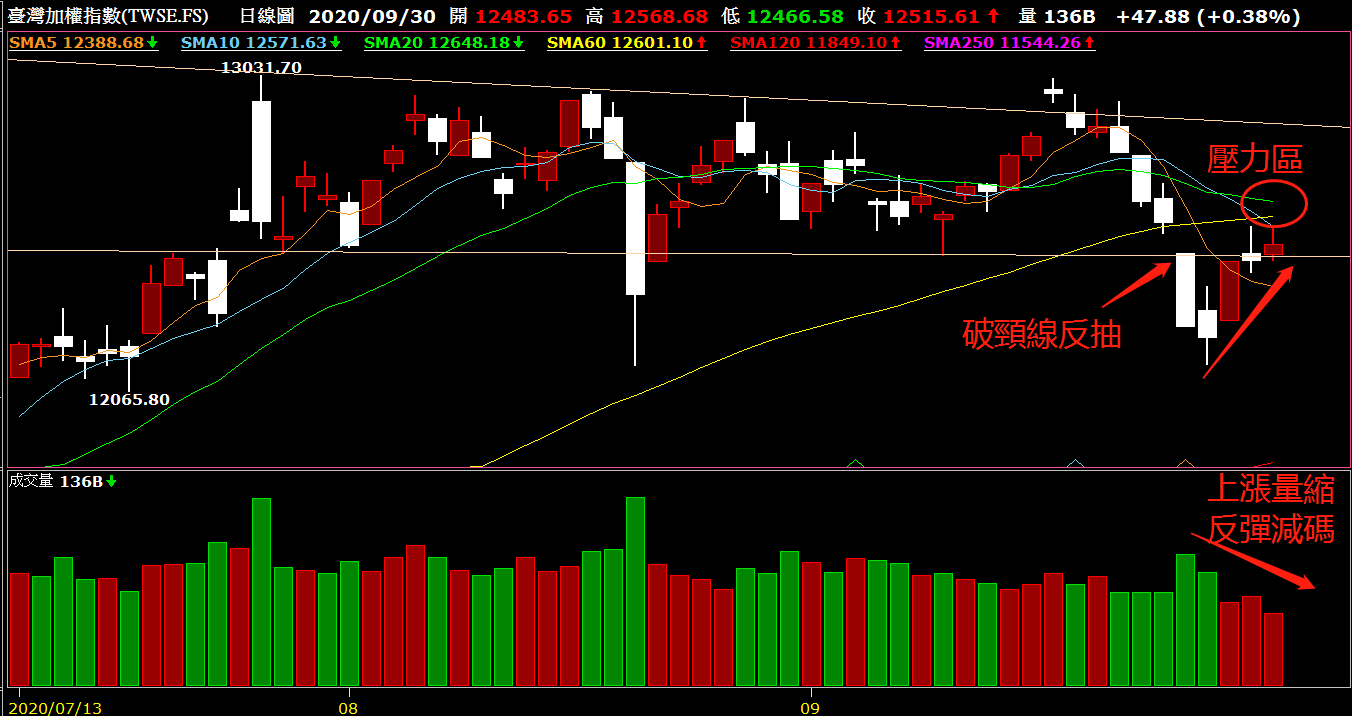 美國大選首場辯論會成為中秋連假前觀望的最佳藉口,全市場聚焦在川普跟拜登的口水戰,多空都謹慎,賣壓不重,於是指數繼續反彈,但來到均線壓力又缺乏買盤推升,留上影線。好吧,如果市場這麼敏感的話,那麼接下來的季線攻防戰,多頭就不容易佔上風,因為33天後最大的不確定因素-美國大選結果等在後面,一場辯論會被川普攪黃了就導致小道瓊股指下跌3百餘點,那麼更不用想如果川普不承認落選,不和平交接政權,到時候小道瓊股指要怎麼個跌法?再一次10天4次熔斷嗎?讓我們繼續看下去,川普會出什麼怪招來逆轉勝。