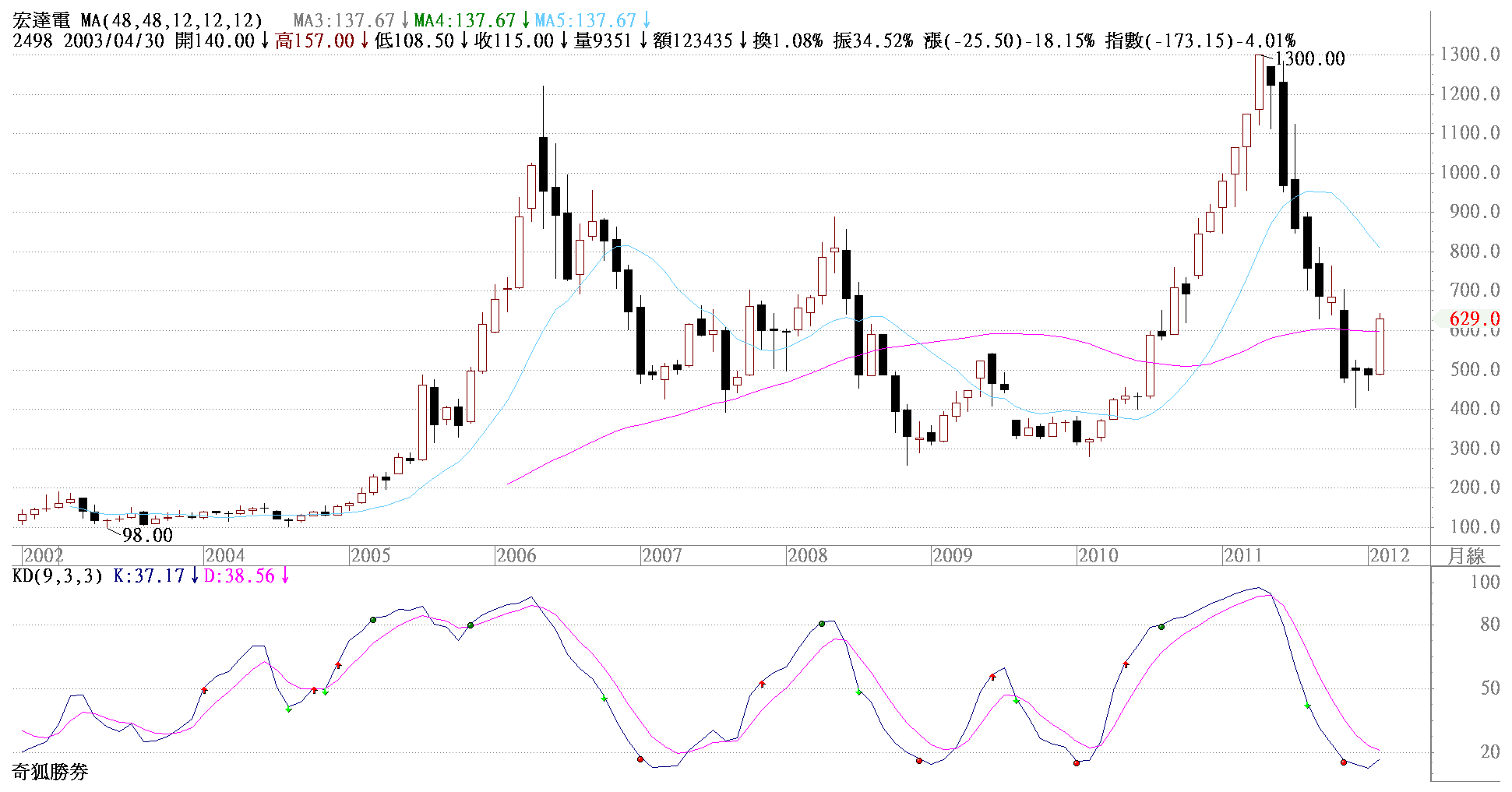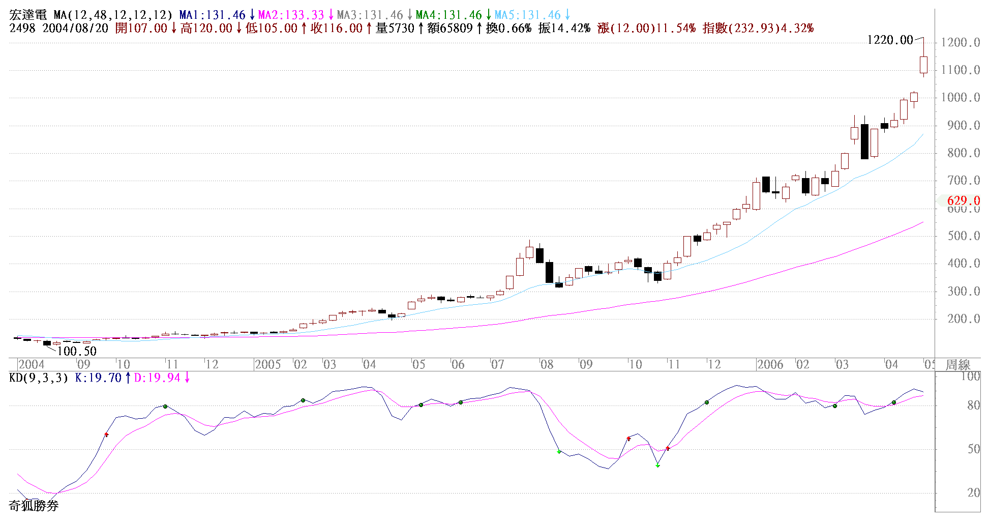 (2)從宏達電的月線圖於2005/03/31出現KD指標由下往上突破80的訊號之後,這邊開始漲了十三個月,從182元附近買進到高點1220元,出現六.七倍的漲幅,另一次宏達電其月線圖於2010/08/31出現KD指標由下往上突破80的訊號之後,上漲八個月,其利潤也有二.二倍左右。