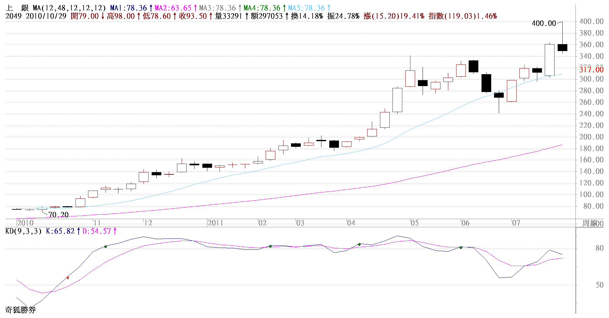(1)我們來看上銀的周線圖,於2010/11/12出現周KD指標由下往上突破80之後,連續二十四周指標大部分的時間都在80~100這個軋空位階,只要出現這個現象,就是告訴我們要抱牢持股,減少看盤的次數。