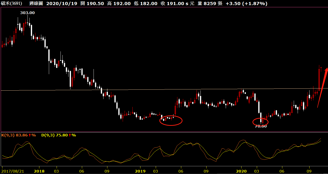 太陽能九月營收以國碩與碩禾的成長力道最明顯,恰巧碩禾董事會決議辦理私募現金增資發行普通股,股價偏多是合理的預期,十月十六日當周上漲34.89%,以大陽線突破147元頸線壓力,確認底部型態。