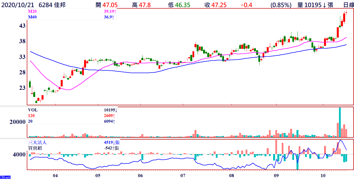 佳邦(6284):電子保護元件及天線產品領導廠,受惠5G通訊技術商轉應用推動,今年營收表現亮眼,九月營收五.七三億元,創歷史新高,月增率九.六一%,年增率三四.四七%;今年前九月累計營收三七.三八億元,年增率二○.八三%上,同創歷史新高。