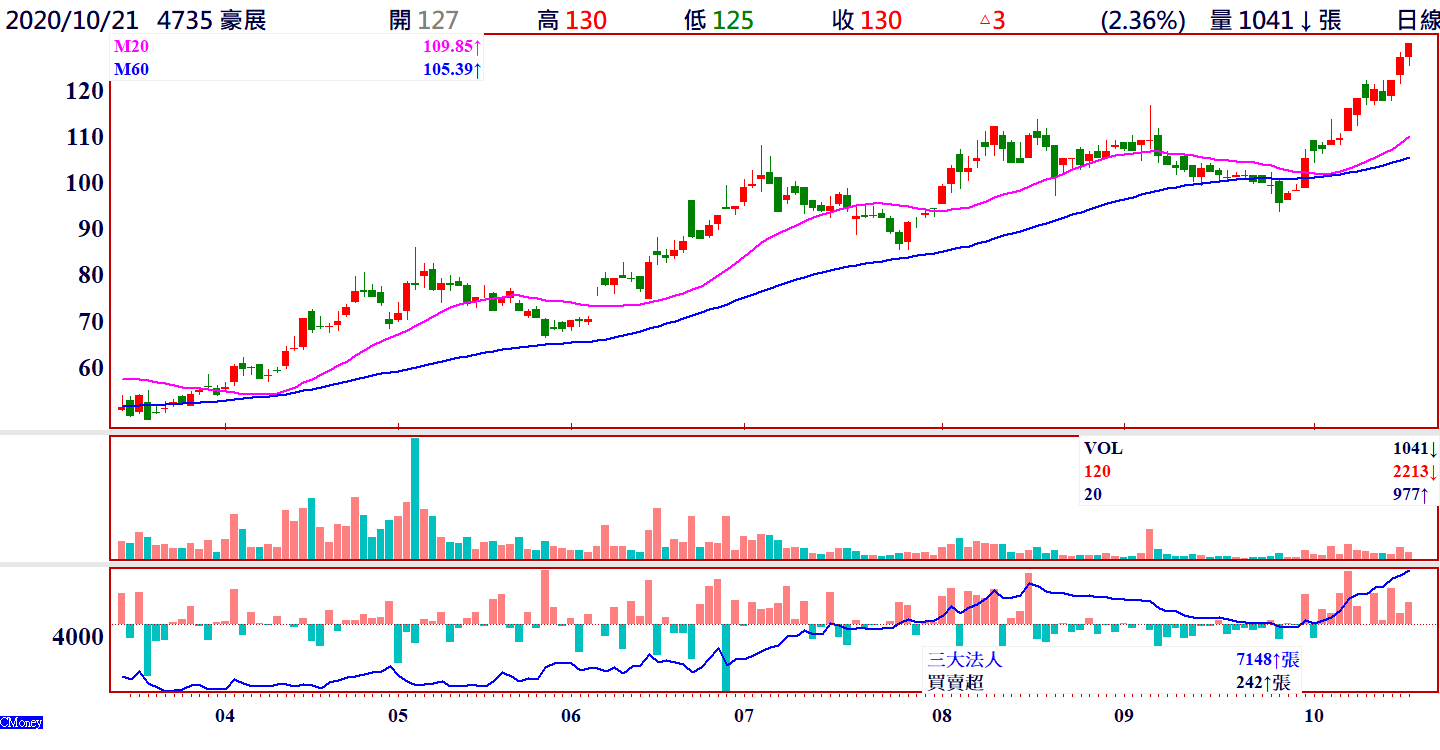 豪展(4735):紅外線測溫(營收占比五六.八三%)、電動吸鼻器及電子血壓計(營收占比四○.四九%)專業廠,公告九月營收三.一七億元,月增率○.五一%,年增率高達一九三.七二%,七、八、九月連續三個月營收創歷史新高。第三季營收九.三三億元,季增達一.六五倍,同步創新紀錄,年增達一.八四倍。法人預期,豪展第三季EPS可望超過五元水準,第四季營收業績展望十分明朗。今年前九月累計營收一五.四八億元,年增率七一.三七%。