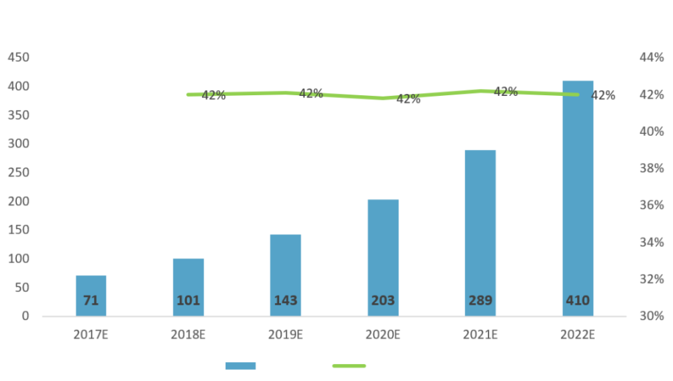 根據Market&Markets預估,二○二二年全球室內定位市場規模將從二○一七年的七一億美元增加至四一○億美元,對應二○一八至二○二二年的年複合成長率為四二%。另根據國際電子商情預估,二○二二年全球UWB室內定位市場規模將從二○一八年的三十億美元增加至一二三億美元,對應二○一九至二○二二年的年複合成長率為四二.三%。