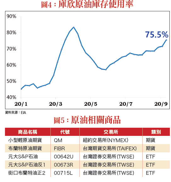 雖然油價自四月二十一日暴跌後一路反彈至八月中仍持續創高,但庫欣原油庫存使用率卻也同步逐漸攀升,並在近期突破了七成水位,而持續遞增的庫存也開始接近了警戒線。再考慮到前文所述,近期用油需求的下滑與產能持續的回升,將使庫存在未來一段時間不斷墊高,究竟會在哪一個時點觸發拋售潮我們不得而知,但可以確定的是在供需漸漸失衡的當下,庫存不斷累積,勢必對於油價產生壓力,短期內創高難度加大,或許須等到十二月底冬季用油旺季的來臨,或是疫苗有突破性的進展,才能再次激發原油向上的動能。