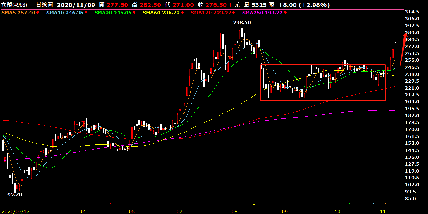 例如立積未採用美國企業的EDA軟體,也未採用美國的技術,其射頻前端模組可搭配高通(Qualcomm)、博通(Broadcom)、聯發科、瑞昱、安森美(ON Semiconductor)、Celeno等六大WiFi主晶片廠出貨,而立積主要投片對象是宏捷科,次為台積電,所以立積的產品銷售給華為並未受限制,是美國政府華為禁令下的受惠公司,公司在第二季法說會前後不只一次的聲明,但市場聽不進去,先跑先贏,股價過了三個月的區間震盪後,終於等來了拜登的勝選利多。