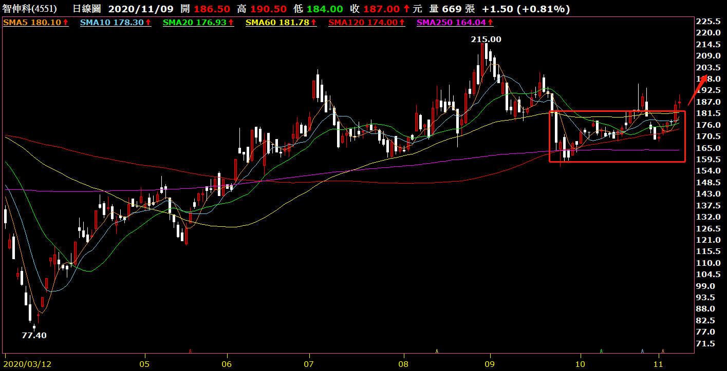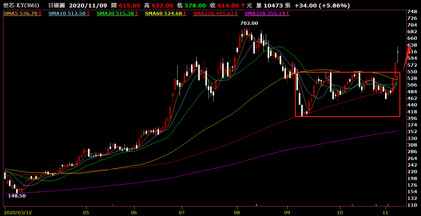 世芯-KY的營收比例來自中國的占比最大,由於華為禁令,公司的客戶已經成為中國本土廠商在非美系CPU的首選,隨著中國CPU市場逐步成長,十六奈米製程、七奈米製程皆有CPU客戶量產案,從二○二○年下半年到二○二一年上半年陸續進入量產,因此業績動能可望持續進行成長。股價在十一月四日的481元起漲突破季線壓力,重新回到均線多頭排列格局。