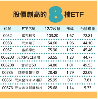 而有「國寶ETF」之稱的台灣50 ETF,台積電雖占權重達49.25%,逼近5成水位,不過因其他權值股漲跌表現不一,略為淡化上攻力道,2日收在115.4元,距離11月23日的歷史新高115.45元價位僅差0.05元。