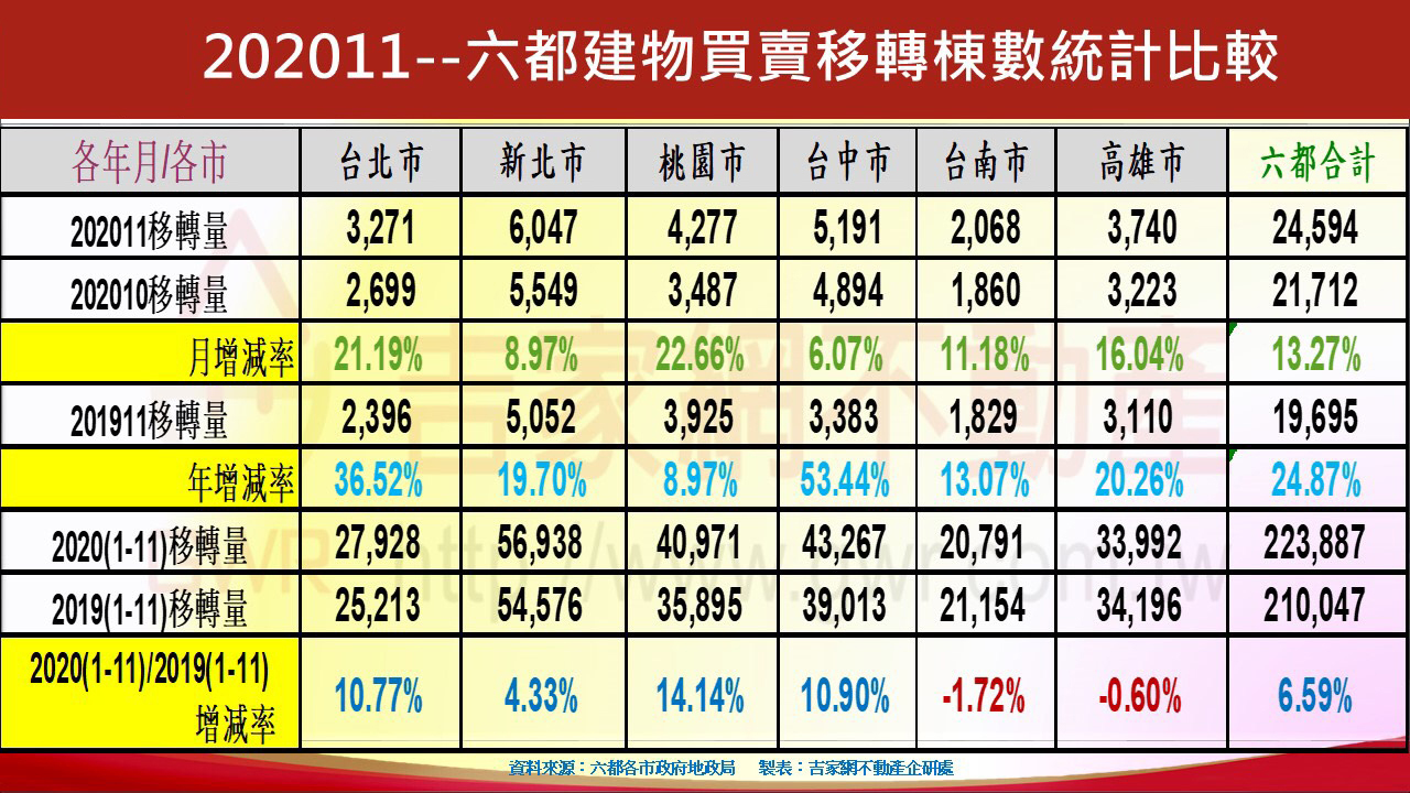 2020年上半年全台房市六都成屋房價年漲幅分別是台北市+3.33%、新北市+3.35%、桃竹+12.97%、台中+9.81、台南+15.6%、高雄+11.17%,平均總價也同步拉升,台北市已高達每戶2087萬元的高均價水平。