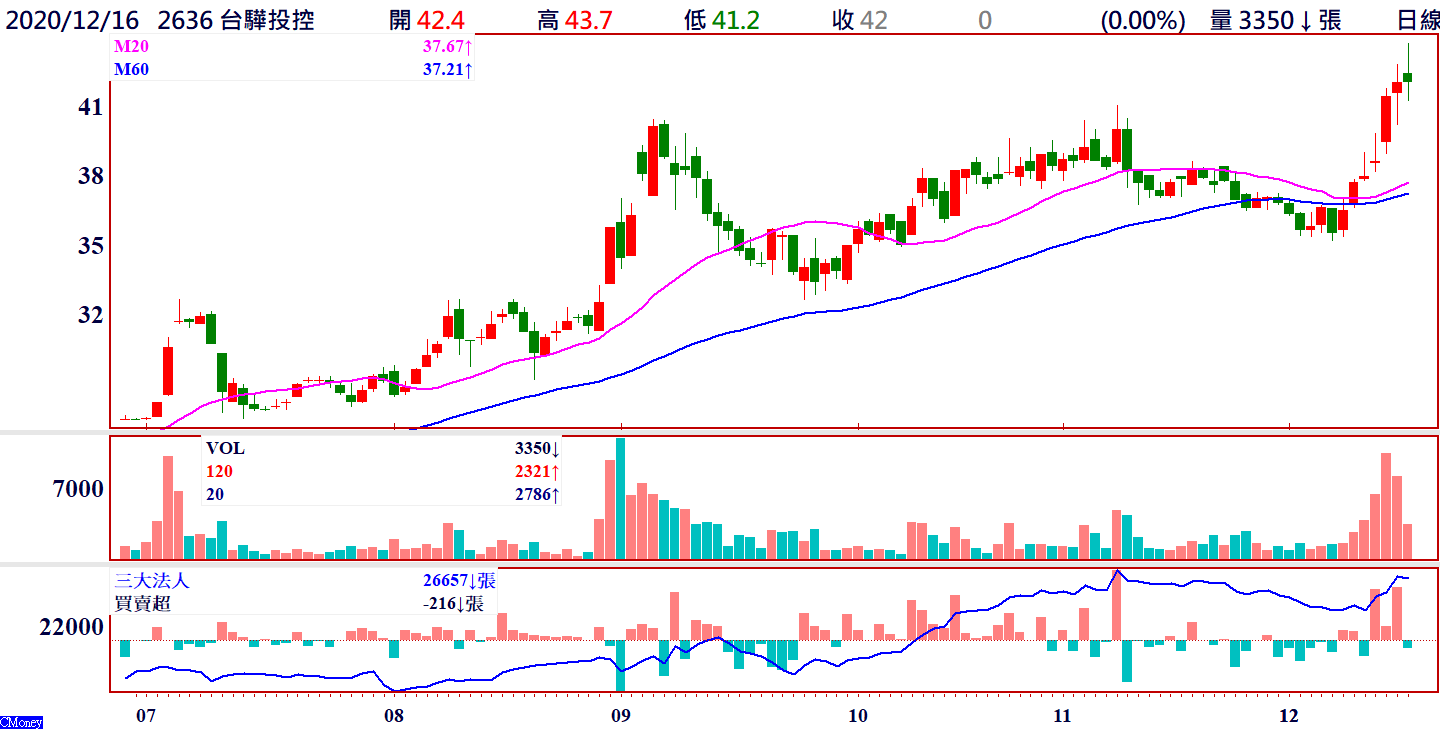 台驊投控(2636):航運以「海運歐美長程線」為主,十一月營收一五.九五億元,創歷史新高,月增率一○.一九%,年增率六○.三六%;今年前十一月累計營收一三三.三一億元,年增率二九.五二%。