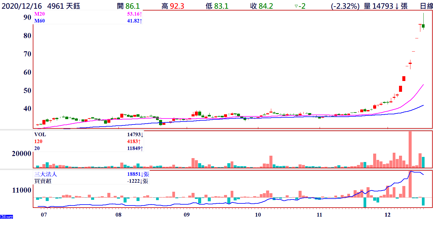 天鈺(4961):驅動晶片廠,十一月營收一二.六三億元,月增率一八.七三%,年增率達七一.一九%;今年前十一月累計營收九五.六九億元,年增率一四.七七%。天鈺指出,第三季受惠疫情帶動宅經濟拉貨需求持續,旺季效應明顯,推升營收走揚達二九.三七億元,季增率三三.○二%,年增率二四.九三%,創歷史新高。