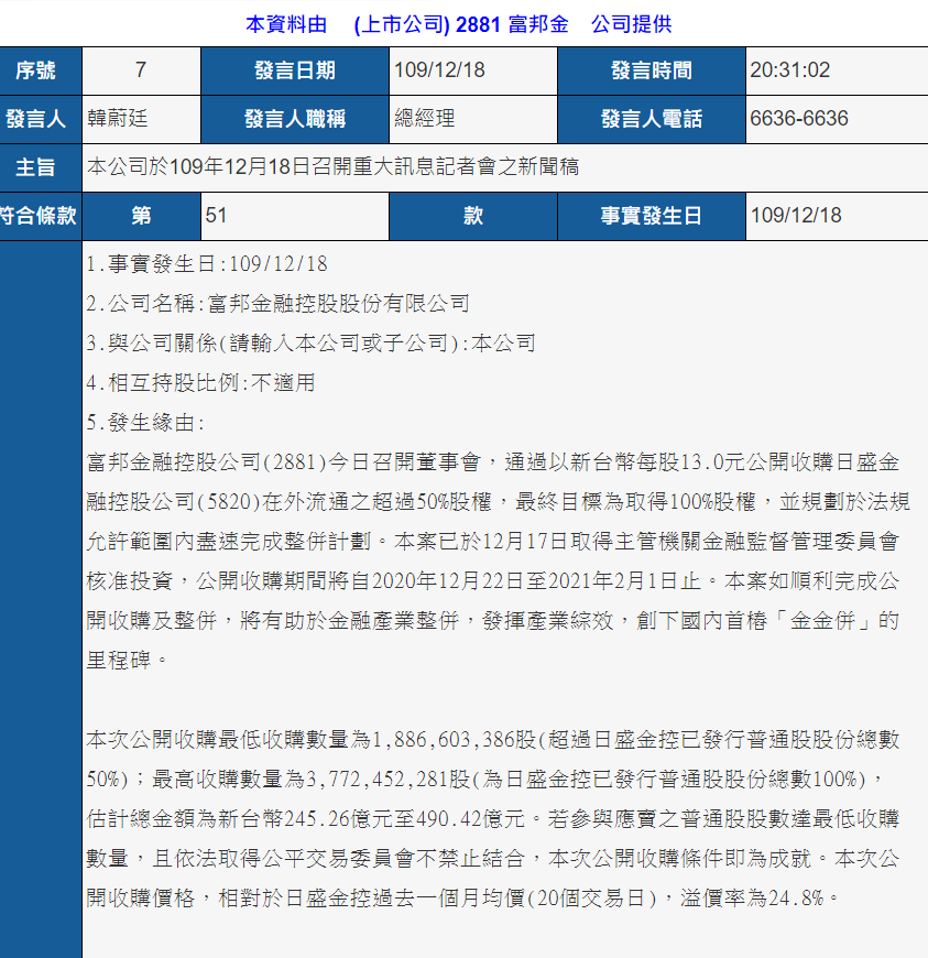 富邦金 (2881)今召開董事會,通過以新台幣每股13.0元公開收購日盛金,融控股公司(5820)在外流通之超過50%股權,最終目標為取得100%股權,並規劃於法規允許範圍內盡速完成整併計劃。