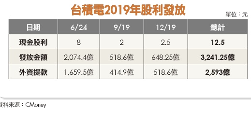 首先要說明,台積電自從2019年起改成「每季配息」,2019年第1季的股利在2019年9月19日發放,第2季的股利則是在12月19日發放。加上2018年全年的股利在2019年6月24日發放,台積電的投資人在2019年會領到3次股利。