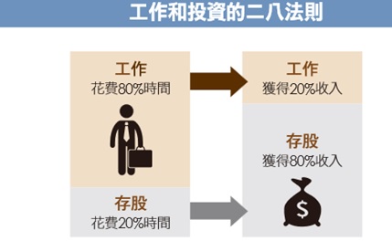 一般人在下班或放假時,通常會把80%的時間投入休閒娛樂,像是上網追劇、玩手遊等,只會把20%的精力用於閱讀和學習。二八法則其實也很殘忍地發生在上班族和股市投資人身上,大多數上班族要用80%的時間來工作賺錢,只剩下20%的時間留給自己和家人;但是專心存股票當股東,卻只要用20%的時間研究股票,剩下的80%時間都可以用來遊山玩水、享受人生。