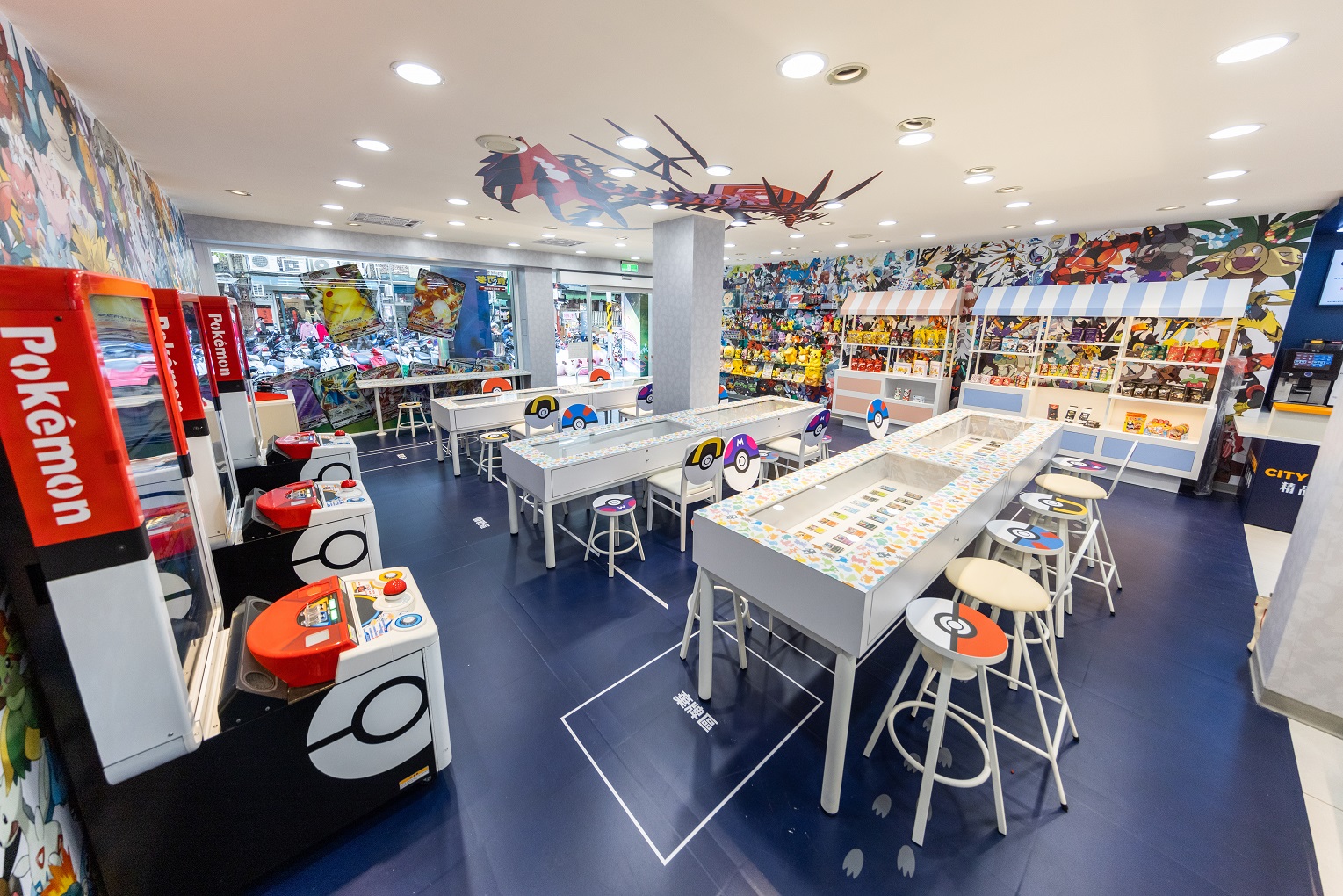不僅如此,座位區桌子使用不同的寶可夢影子作為設計並展示了歷代值得收藏的卡牌,椅子更是以不同的精靈球呈現,抬頭還能看見最強的寶可夢-無極汰那;除此之外店內更引進了目前最熱門的Pokémon Ga-Olé及Switch機台讓粉絲可以沈浸在寶可夢的世界當中,寶可夢大師快衝一波!