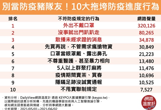 今天《DailyView網路溫度計》透過《KEYPO大數據關鍵引擎》調查,自從本土疫情爆發後,有哪些不符防疫規定的行為堪稱「防疫豬隊友」,看這篇文章的你只要符合一項,也可能因此造成破口,請大家務必配合措施,一同度過這波疫情。
