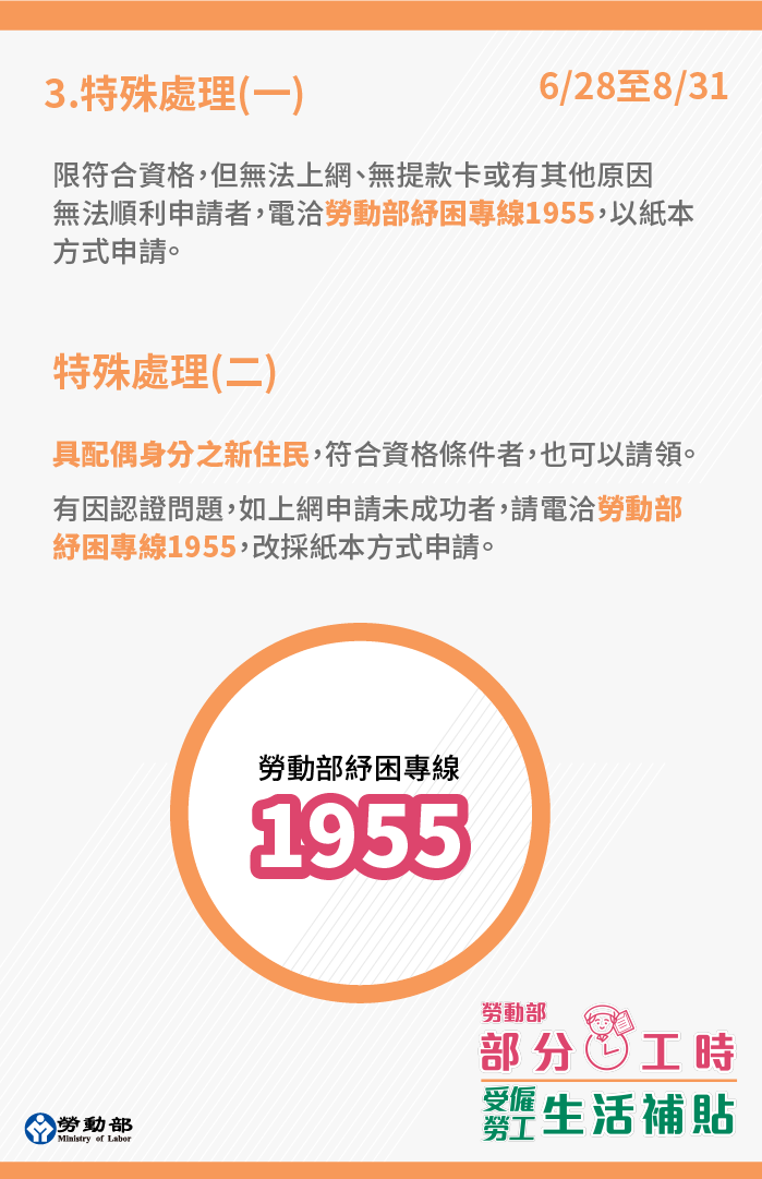 此外,若符合資格,但無法上網、無提款卡或有其他原因無法順利透過前開2種方式順利申請者,可電洽勞動部紓困專線「1955」,以紙本方式申請。