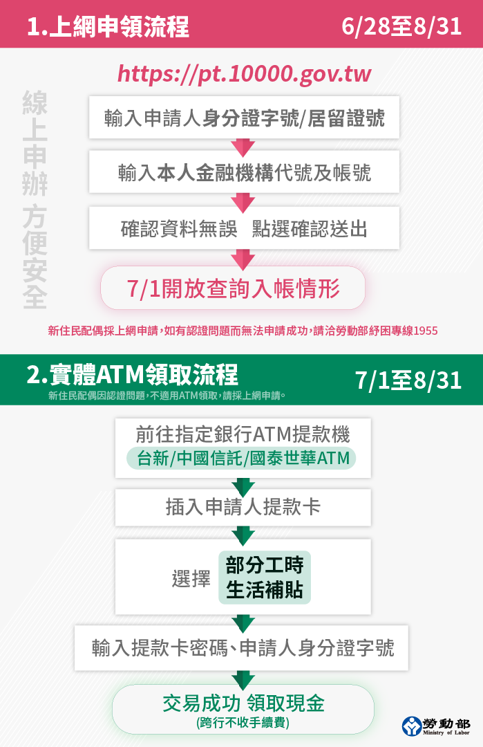 符合資格的勞工則免登記,7月1日起直接持任一家金融機構發行之金融提款卡,至台新、中信及國泰世華三家其中一家實體ATM,插入提款卡後,選擇部分工時生活補貼,輸入身分證字號及提款卡密碼,即可領取1萬元現金。