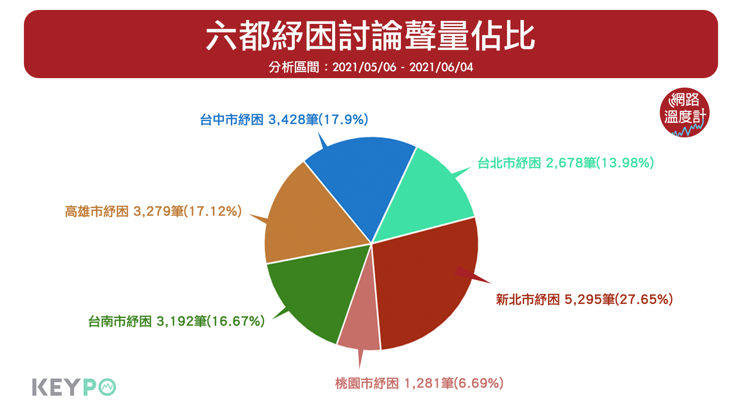 透過《KEYPO大數據關鍵引擎》可以發現,在六都紓困的網路聲量佔比中,第一名是新北市、第二名為台中市,其次依序為高雄市、台南市、台北市與桃園市,新北市成為聲量王。不過若以六都公布的時間來看,台中市可以說是「超前部署」,在5月23日就第一個喊出紓困方案,其他五都則是在這之後陸續跟進才引起關注。