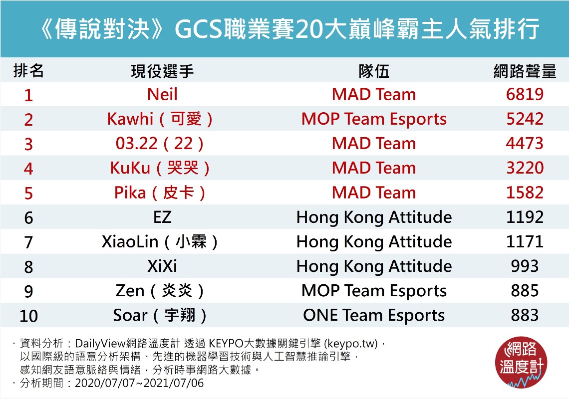 今天《Daily View網路溫度計》透過《KEYPO大數據關鍵引擎》調查,GCS職業賽各大隊伍中的現役電競選手,哪幾位是網友心中的人氣王?不管是活化石級的資深老手,或是新興神手全都開秀,快來看看你支持的選手有沒有上榜吧!