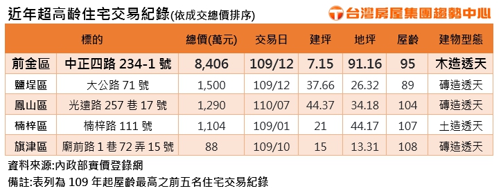台灣房屋美麗島中正加盟店店東劉坤旺指出,從去年至今,高雄也有不少百年老屋交易,屋齡最高為108年,但最有身價的是位於高雄前金區中正四路與成功一路口一戶95年木造老店面,僅7.15坪大小,卻要價8406萬元成交,堪稱近期高雄又老又小又貴的超高齡屋代表。
