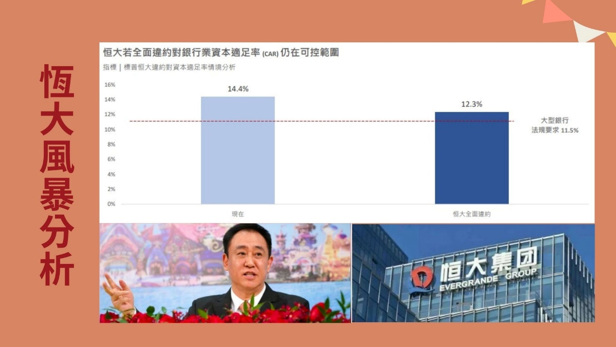 另外,就中國銀行的資本適足率來看,目前是14.4%,即使假設恒大相關債務全面倒債,中國銀行體系的資本適足率仍有12.3%左右,也比中國大型銀行所規範的11.5%要高。