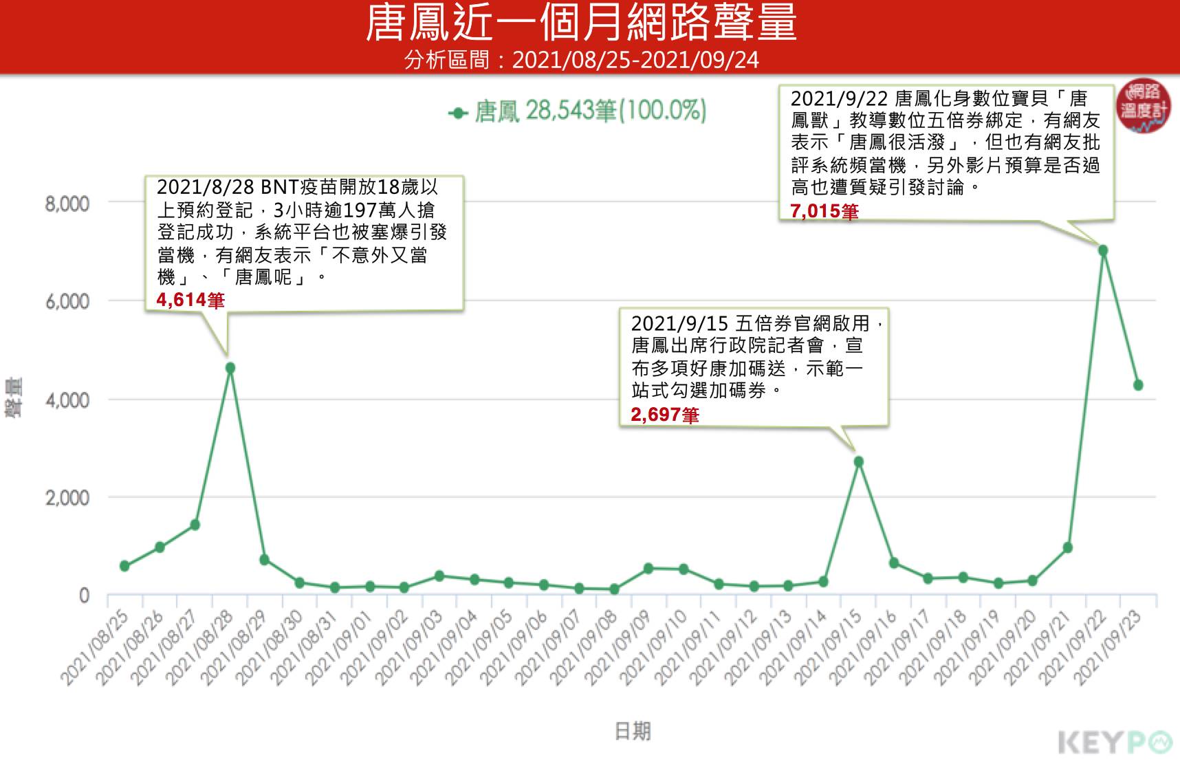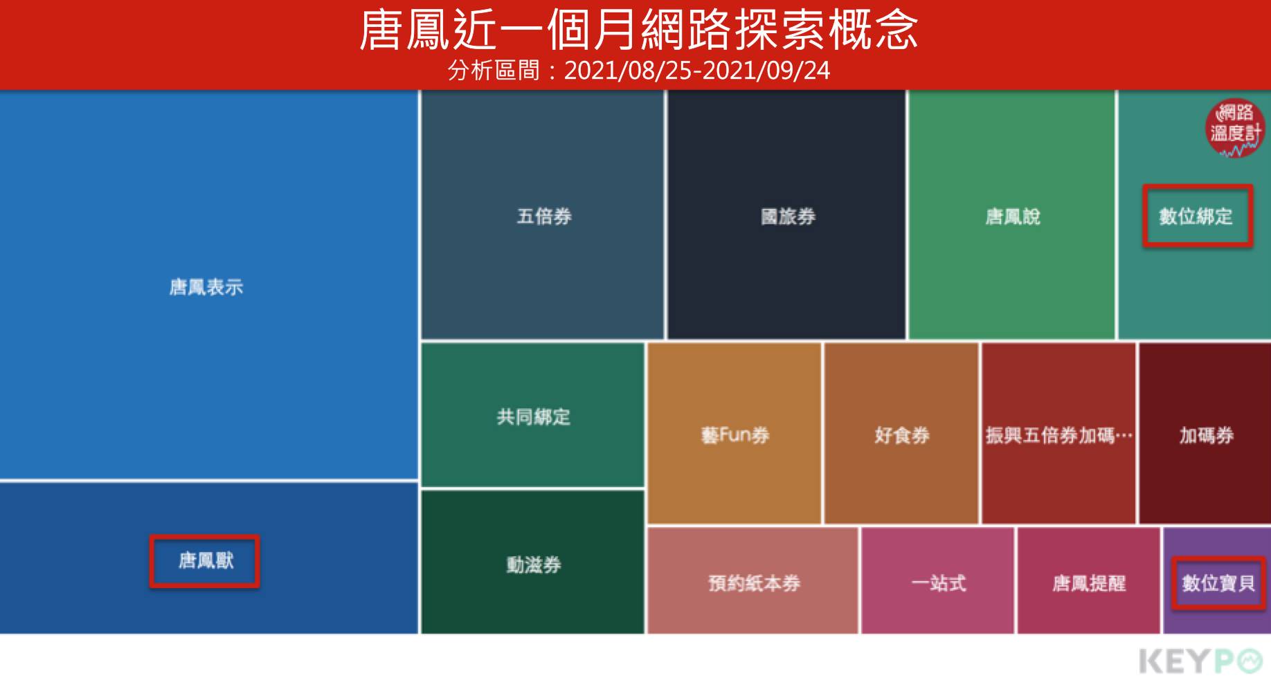 唐鳳近一個月的幾波網路高聲量幾乎都與五倍券有密切關聯,進一步透過《KEYPO大數據關鍵引擎》(2021/08/25~2021/09/24)觀察分析,網路上唐鳳相關概念討論字詞,除了五倍券之外,「唐鳳獸」、「數位寶貝」、「數位綁定」也躍升熱門榜單內,顯見「迷因影片的魔音穿腦」不僅有其成效,也創下網路討論熱度。