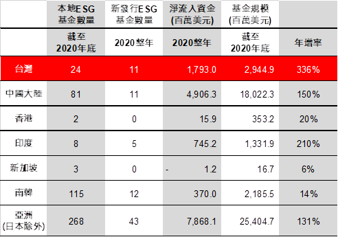 表一:2020年台灣ESG基金規模年增率為亞洲第一