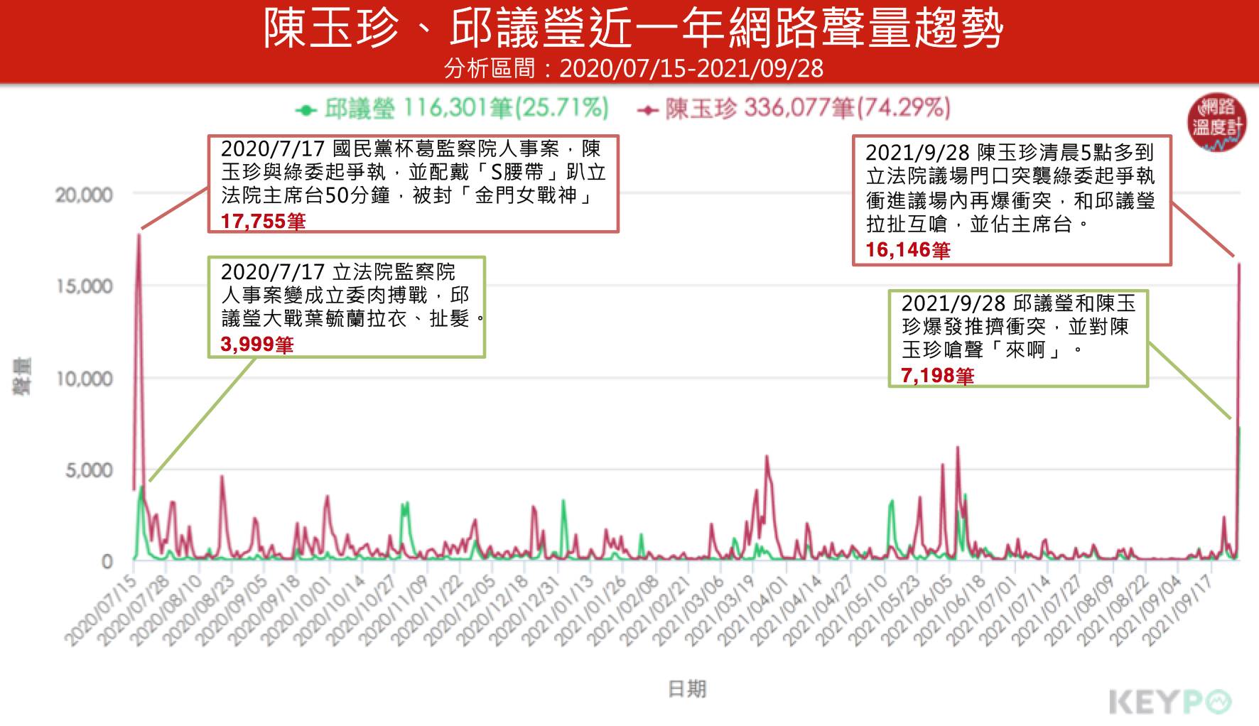 根據《KEYPO大數據關鍵引擎》(2020/07/15~2021/09/28)所做的統計調查,近一年多時間以來,陳玉珍、邱議瑩兩人的聲量高峰全都落在「立法院肢體衝突事件」。陳玉珍網路聲量第一高峰在2020年7月17日共有17,755筆,當時立法院肢體衝突事件讓陳玉珍躍上聲量版面,國民黨立法黨團杯葛監察院人事案,陳玉珍與民進黨立委們起爭執,並且配戴「S腰帶」趴立法院主席台50分鐘,被封為「金門女戰神」;聲量第二名為2021年9月28日有16,146筆,網路討論內容有「陳玉珍1打10大亂鬥」、「拂曉搶灘突擊綠委」、「占領發言台」等等。