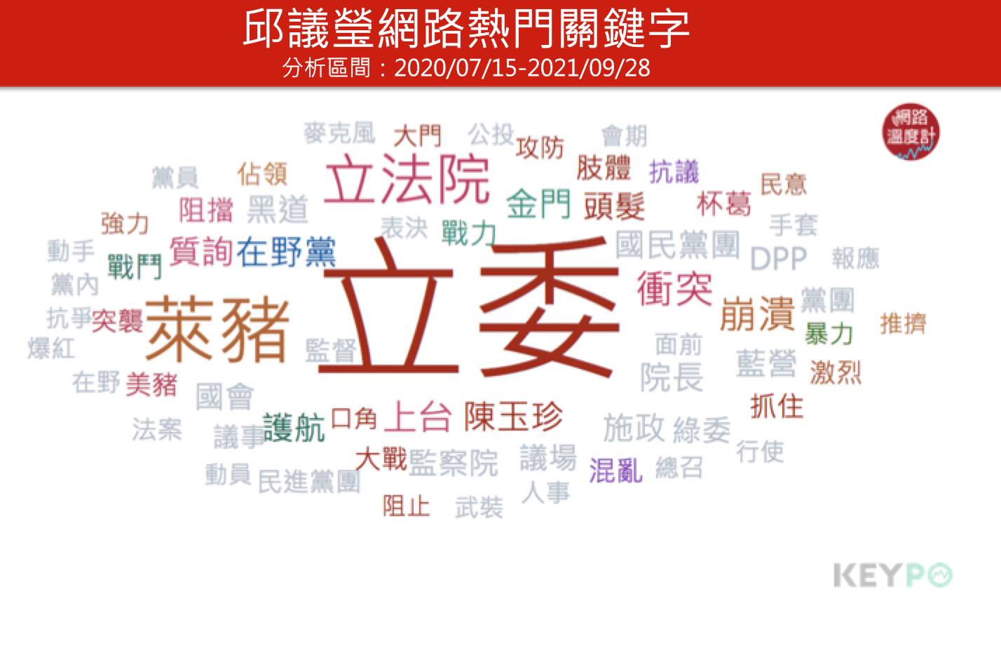 民進黨立委邱議瑩的熱門關鍵字包括「萊豬、口角、肢體、攻防、戰鬥、阻擋、激烈、推擠」,不難看出皆與立法院衝突事件有很大關聯性,其中特別的是「陳玉珍」名字也在邱議瑩的網路熱門關鍵字榜單,兩位女戰神戰力十足,不僅自拚聲量,相互「交鋒搏火」也發揮聲量拉抬效應。