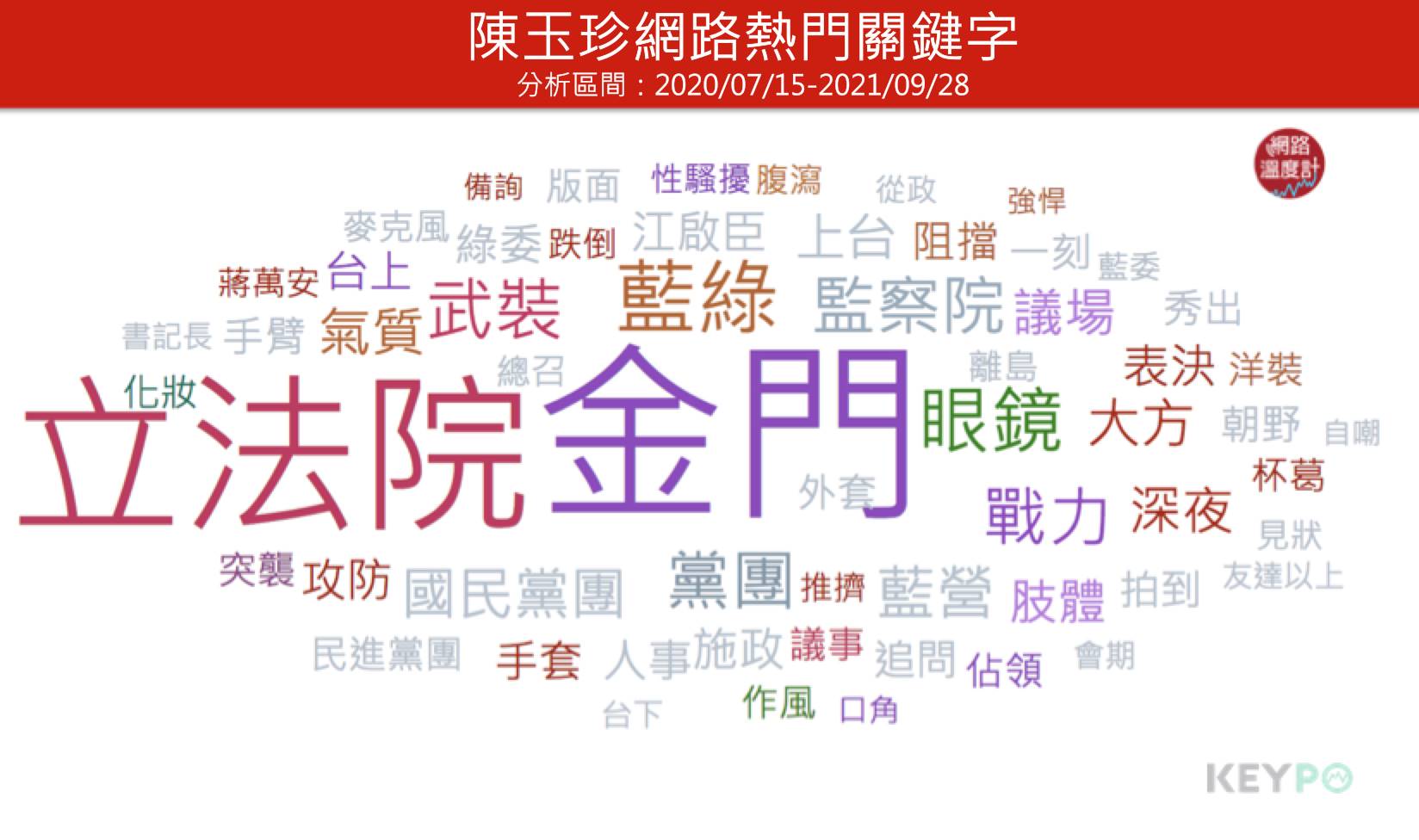 進一步透過《KEYPO大數據關鍵引擎》(2020/07/15~2021/09/28)分析,陳玉珍網路熱門關鍵字除了立法院議事相關事項,「武裝、戰力、突襲、攻防、杯葛、強悍」都在關鍵字榜單內,另外,陳玉珍近期造型、妝容明顯改變,開始運動健身引起不少網友熱議,因此「氣質、眼鏡、洋裝」都有相當大討論熱度。