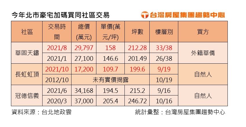 實價揭露,天母指標豪宅「華固天鑄」和士林中古豪宅「長虹虹頂」,都出現同社區住戶再加碼買進其他樓層的案例,「華固天鑄」一位外籍華僑,甫於今年初買進社區26樓戶,8月再以近3億元、每坪158萬元買進33樓,大手筆在台灣砸下約5.69億元買下兩戶天母豪宅。