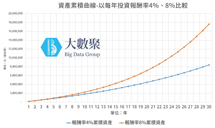 ▲圖2:資產累積曲線-以每年投資報酬率4%、8%比較
