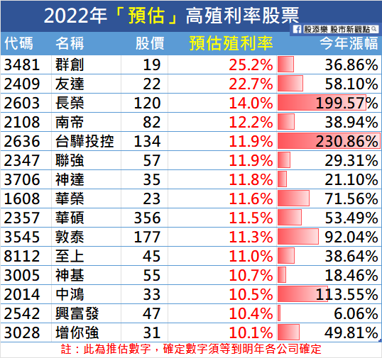 「今年上市櫃獲利數字不錯,明年預估10%以上高殖利率的股票也不少。」陳相州表示,因版面問題,只稍微分享幾檔給大家參考,尤其有不少低調的績優股,明年預估值利率都落7~10%。