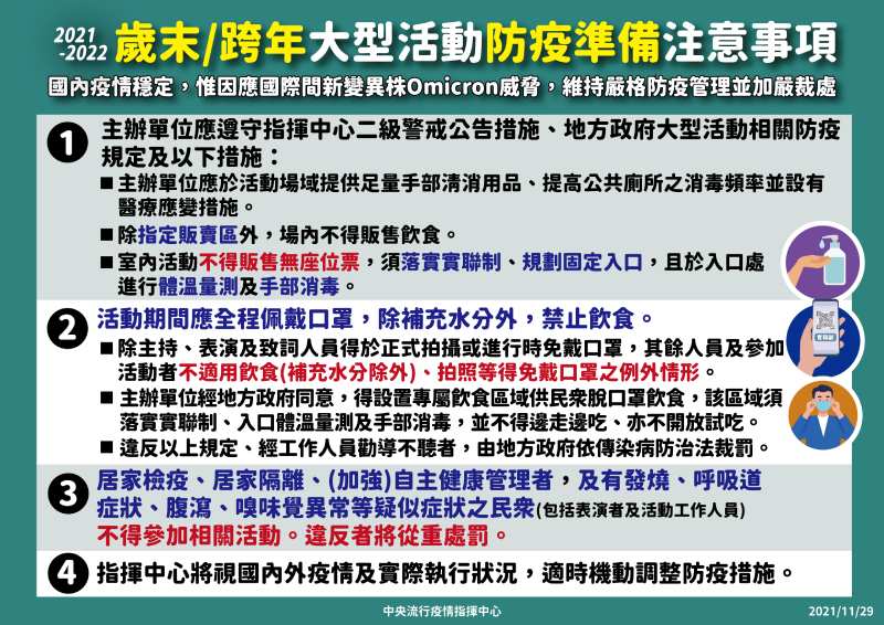 對於即將到來的跨年活動,指揮中心表示,主辦單位應遵守相關防疫規定,如於活動場所提供足量手部清消用品、提供廁所消毒頻率,並設有醫療應變措施、場內不得販售飲食、不得販售無座位票;活動期間應全程配戴口罩等。也提醒居家簡易、居家隔離、自主健康管理者、有發燒及相關症狀者,不得參加活動,違反者將重罰。
