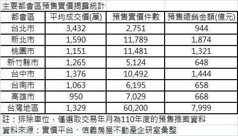 主要都會區的部分,今年揭露的預售案剩下高雄市的平均成交價不到千萬元,其餘五都加上新竹地區的成交總價平均都超過千萬元,台北市平均最高為3432萬元,其次是新北市的1590萬元,台中市1376萬元,新竹1265萬元,台南市1063萬元。