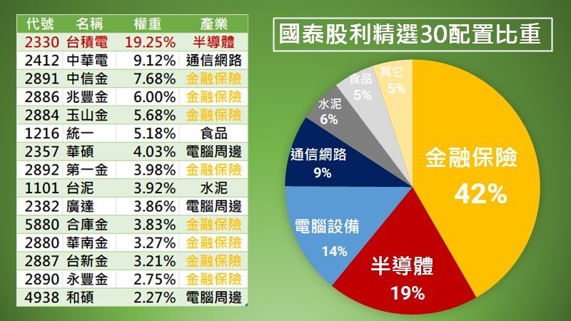最近我才發現,原來2個月前國泰股利精選30(00701)悄悄納進了台積電成為第一大成分股,並且剔除掉幾檔重量型金融股,包含國泰金、富邦金、元大金等。本來我很納悶,怎麼高股息的金融股被請出去,反而買了成長型的台積電呢?
